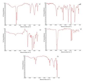 Figure 4: Polymers found in the sediments of Anzali wetland. A: Polyacrylonitrile, b: Polyethylene, c: Polypropylene, d: Polyester and e: Polystyrene