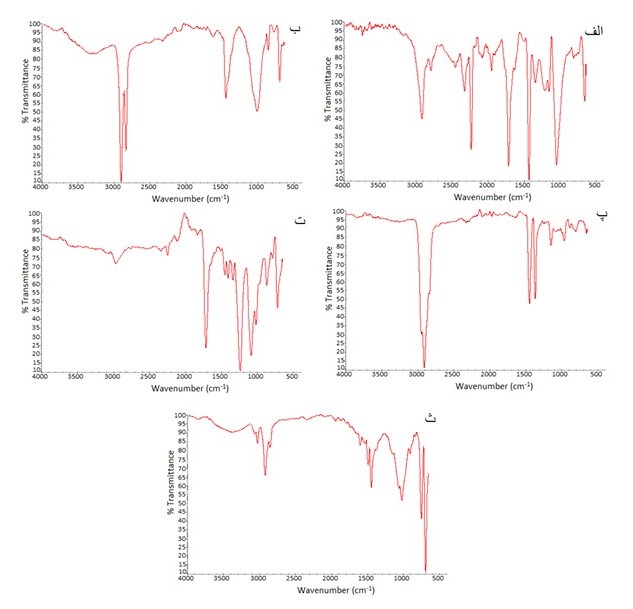 Figure 4: Polymers found in the sediments of Anzali wetland. A: Polyacrylonitrile, b: Polyethylene, c: Polypropylene, d: Polyester and e: Polystyrene