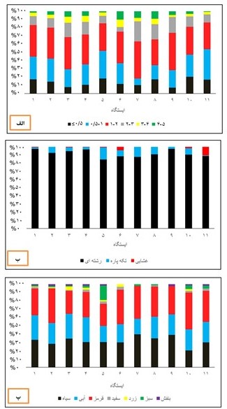 أشأنˇ شکلˇ جأيم, شأ ميکرؤپلأستيکأنأ 3 تأ جرگه-يه رشته-يي, تيکه-پأره ؤ غشأيي دۊرۊن جزئن. نتيجه-أن نيشأن بدأ کي رشته-يي ميکرؤپلأستيکأن ويشتري فتˇ فرأوأني-يأ تۊمأمˇ ايسگأئأنˇ دۊرۊن دأريدي (شکلˇ 3 ب). أ وأرسي دۊرۊن ميکرؤپلأستيکأني کي تأکأ بؤستيد هف تأ رنگˇ سييأ, سۊرخ, آبي, زرد, سيکلمه, سبز ؤ سيويد بيد. سۊرخ, سييأ ؤ آبي به رج 1/34٪ ؤ 8/30٪ ؤ 4/26٪ مرأ ويشتري فتˇ فرأوأني يؤ سيکلمه ؤ زرد نى به رج 2/1٪ ؤ 8/1٪ مرأ کمتري فتˇ فرأوأني-يأ دأشتيدي (شکلˇ 3 پ).